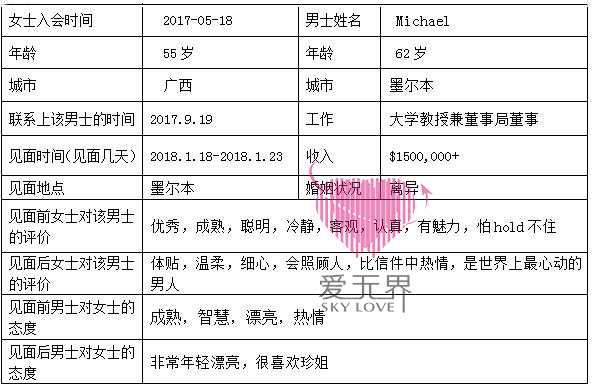 在接触了澳洲男士Michael后,珍姐彻底被Michael身上的学术气息吸引,她觉得Michael是一位非常绅士,智慧、博学、坦诚、冷静客观的人,他任职于大学教授,学位是商务管理博士,同时兼任学校董事,经常做慈善项目和基金,他对待事物的态度非常严谨认真,这一切都让珍姐着迷。