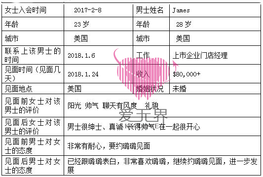 约会见面的地点就在璐璐住房的附近。两人计划着约会的行程安排是一起吃饭庆祝生日,然后男士陪璐璐一起看电影,然而James没有告诉璐璐在哪里吃饭,这让璐璐有些摸不着头脑,原来男士提前在网上查看了璐璐家附近的日式餐厅,请璐璐吃亚洲餐,他想着这应该更合璐璐的胃口也算是给予璐璐的生日惊喜吧,结果两人吃饭期间聊得太开心,不知不觉就吃了一个下午,最后连看电影的时间都错过了,这是璐璐在美国过的最开心的一个生日了,James帅帅的脸和洁白的牙齿在脑海里挥之不去,想去来心里经常泛起一丝丝甜蜜。吃完饭后James陪着璐璐慢慢走回家,一下午的相处已经让两人有些不舍分开(在璐璐所处的美国当地,商店关门的时间很早,晚上没有娱乐项目),临分开的时候James不停的跟璐璐说下次一定要带她去吃铁板烧、陪她看电影。
