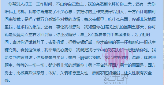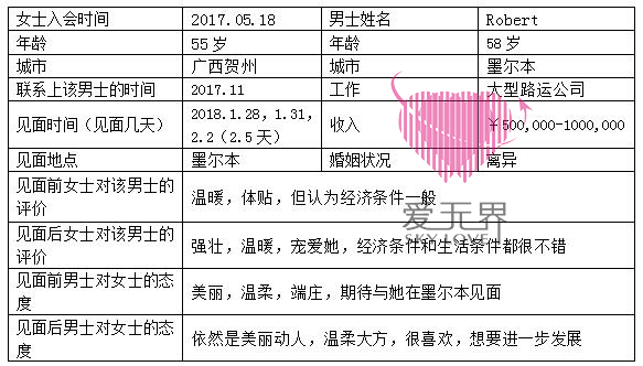 刚开始入会的时候,因为珍姐从未接触过西方男士和西方文化,所以很多思想非常传统,认为女人应该矜持点,应该等待男人来中国见面才算有诚意,经过几个月的服务后,珍姐慢慢学习西方的文化,开始打开自己的思维。