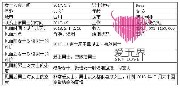 来自四川,33岁的菲菲,2017年3月2日加入阿里红娘,2017年9月,通过阿里红娘平台与来自澳大利亚,49岁的Dave相识。Dave任职人力资源经理,家里经济条件也是非常的好,有车船、两栋别墅!