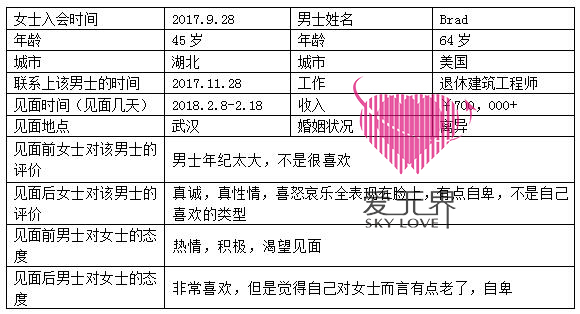 见面如约而至,几天的相处都非常愉快,Brad是一个直率、真诚的人,喜怒哀乐都会表现出来,既可爱又直接的一位西方男士,毫不掩饰,适应能力也很强,来到武汉丝毫没有感到不适应,对女士和女士家人也很好。即使男士很真诚对Annie很上心,但10天的相处让Annie更加的了解西方男士,更真切的感受到与西方男士相处的真实感觉,这一切让Annie更坚定要寻找西方男士的想法,只是Annie对Brad还缺少了一些心动。