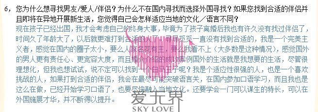 今年45岁的Annie,来自武汉,是一名公务员,身为部门负责人,在工作中多数与律师打交道。由于女儿在美国读书,Annie也是一心想要找一位美国男士。对于寻找伴侣,Annie的回答如下: