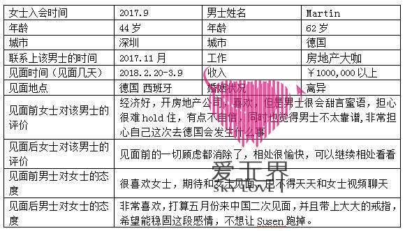 服务团队根据和Martin通信的情况,及时邀请男士通过更加快捷的方式联系,和男士建立更加紧密的联系。在一段时间私下联系后两个人的感情迅速升温,并且提到见面计划,Martin向Susen发出了邀请,希望她能到德国去见面也顺便让女士了解自己的生活环境,同时计划了从德国转到西班牙等地旅游的计划。Martin也很贴心,表示酒店、机票等一概不需要Susen考虑,Martin会全部安排好。