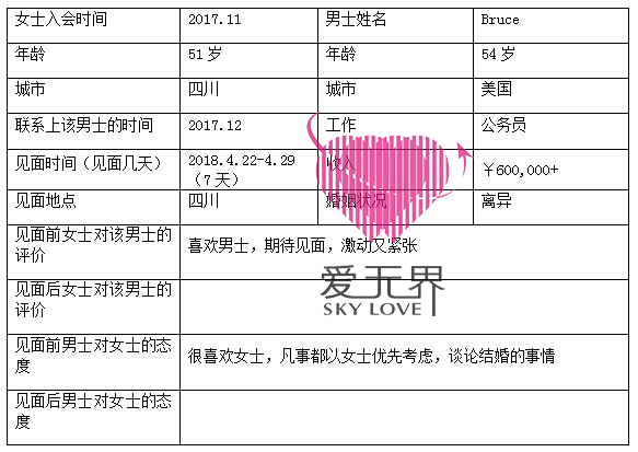 2017年11月,加入阿里红娘,在情感教练的指导和杨姐自身的努力下,杨姐很快就吸引了不少男士的青睐。杨姐一直渴望能有一个真诚爱她的男人,不求男士有多帅气的样貌、不求男士有多优越的经济条件,因为女士说:"自己前夫长得很帅,但是那又怎样呢?关键还是要这个男人爱自己才行。"经历过婚姻的女人看透了那些表面上的东西,更多的是希望两颗心可以相爱,正是因为这样的心态,让她很快遇到了一个爱她的男人Bruce。2017年12月,翻译老师给杨姐推荐了来自美国54岁的Bruce。巧的是Bruce也是一名公务员,负责航空安全管理的工作。同时,杨姐还有另外几位男士在联系着!