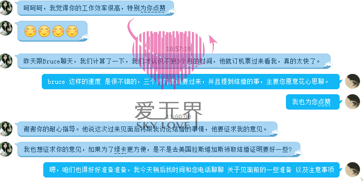 经过3个月的相互了解和感情的培养,虽然两人只相识不到4个月,但感情已经发展到愿意发自内心的为对方着想的地步了。Bruce在3月22日已经订好了4月22日来中国的机票,给杨姐发来了自己的定机票的信息,并且和杨姐谈论到结婚的事宜。这一次Bruce是带着求婚的诚意来见杨姐和杨姐的家人的。杨姐也早早的就计划好了一切行程安排,期待Bruce的到来,内心既激动又紧张。接下来教练会给杨姐做见面的指导,杨姐说:"你们服务人员都非常专业、认真与负责,我很庆幸,这次我的选择是对的,我相信你们是真正在做实事的企业,感恩!"杨姐与Bruce的见面结果会怎么样呢?请大家密切关注我们的动态分享哦!