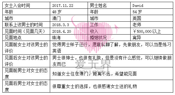 4月初的时候,Gloria刚与一位美国大学教授见过面。很快又和来自英国,54岁的David谈及见面的事情。经过之前的见面经验积累,Gloria也掌握了其中的技巧,也明白:真实的见面相处能更深入的了解彼此相处的感受,有利于彼此感情的进一步确定和发展。