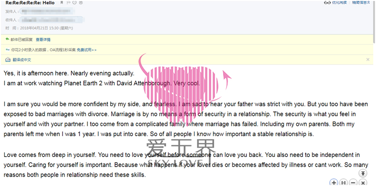 备注:该男士名字叫Kai,37岁,来自澳洲,男士是做医疗工作的。女士来自云南,是一位非常美丽温柔的女人。男士是一个很开放,懂得为女士着想的男人。双方的想法很契合,都想要一个家庭,想要生自己的小宝宝。每天的来信彼此间都会分享互相对爱情的想法,男士看出女士在情感上的不安全感之后也主动说他也认为婚姻是很重要,并且确信女士在他身边会变得更有安全感,更加无惧。
