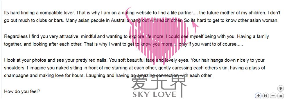 无论如何我觉得你非常的吸引,你让我很难忘很想知道更多关于你生活的事。我能想象到我们一起组成一个家庭,然后互相照顾。这就是我想知道你更多的原因,当然前提是你也是这样想的我才能了解你更多。