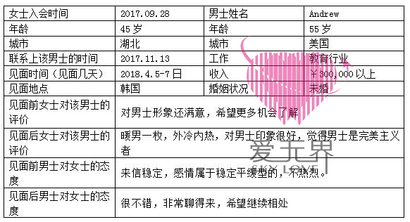 自加入阿里红娘以来,Annie陆续交流见面了几位男士,但始终没有心动的那一个。前不久刚与来自美国的Brad见面后,2018年4月5日与来自韩国的Andrew相见。Andrew今年55岁,韩国裔美国人,从事教育行业。目前暂时被美国总部派遣到韩国工作。2017年11月13日,在翻译老师的推荐下,两人开始交流,彼此感觉都不错,也偶尔谈及希望能见到对方。