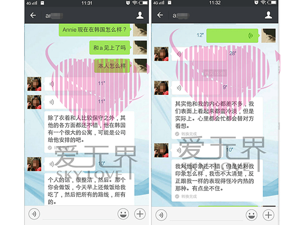2018年4月5日,Annie飞往韩国,出发前,教练再次给Annie做了一轮见面前指导,再加上以往的见面经验,Annie早已驾轻就熟。当天晚上女士抵达韩国机场,交往已久的两人终于见面了,羞涩的两人来了个热情的大拥抱后,男士帮助Annie先安顿下来。