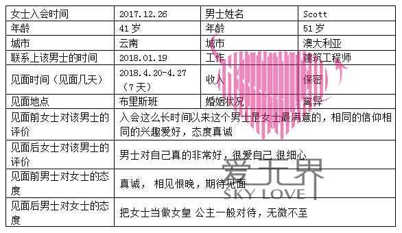 4月20日,男士早早到达机场等待女士的到来,见面后两人热情的拥抱,宛如许久不见的恋人。几天的相处,Kathy深刻的体会到男士的真诚淳朴、细心,无论女士想去哪里玩、想吃什么,男士都极力安排,力求做到女士满意。面对眼前这个体贴入微的男士,Kathy的心一点点的被他占据了。开心的日子总是过得非常快,转眼间,Kathy就要回国了,彼此带着依依不舍的心情say goodbye。临别前,Scott承诺六月份会到澳门看望女士,两人的发展将会得到更进一步的确定?小编总是那么期待有情人终成眷属。