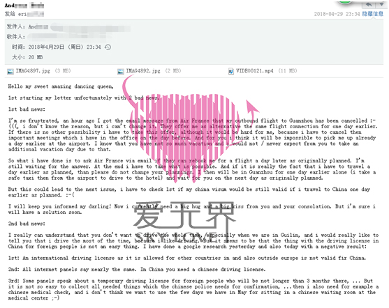 第一个是我好沮丧,因为一个小时前我收到了来自法航取消我飞往广州航班的邮件。我连原因都不知道是什么,但是我又改变不了。他们给我安排提前一天出发飞往广州的航班,如果没有其他的选择我就必须选择提前一天飞。我还要取消那天的重要会议,加上你之前说的没有办法提前一天到机场接我,我知道你说你没有太多的假期,我也不想让你因为航班的事情去额外请假一天。