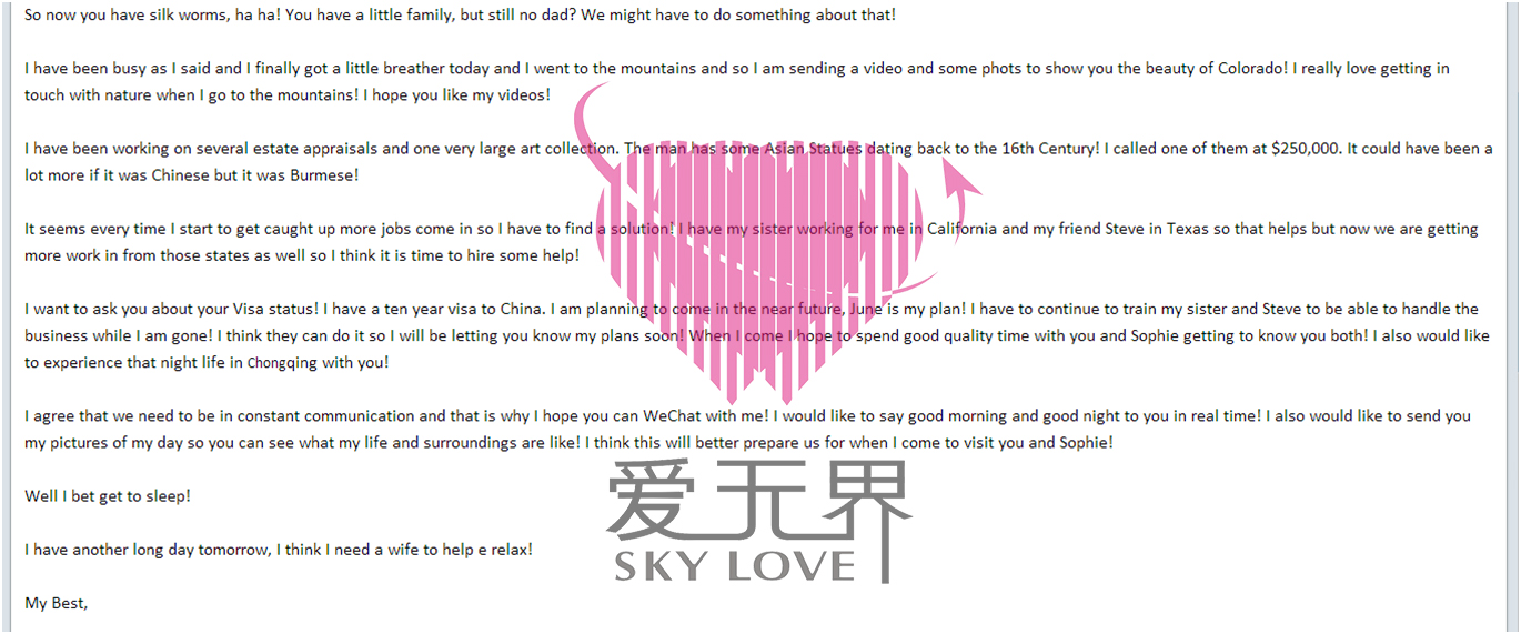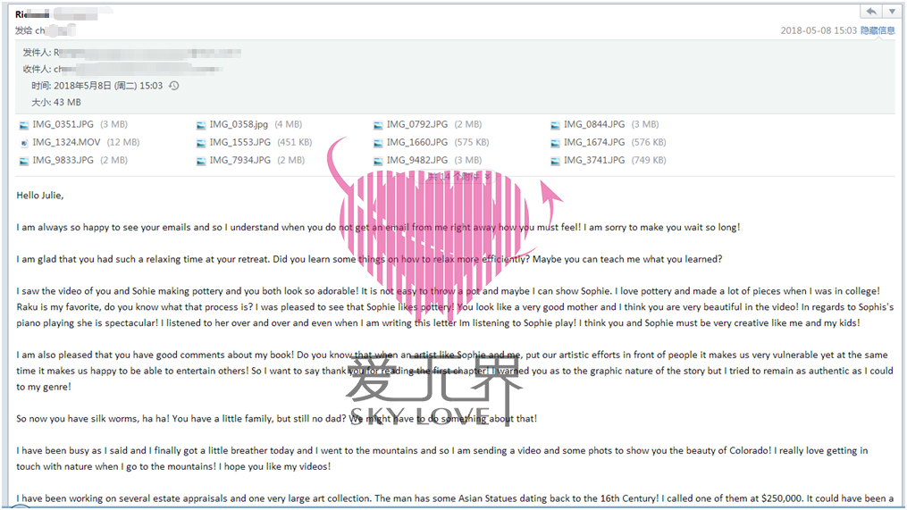 女士Julie45岁,但是在外貌上非常年轻。女士事业成功,而且也对艺术,文化,读书非常感兴趣,对自己要求也很高,经常到其他国家学习体验别国的文化。寻找有着相同价值观,能够懂得品味艺术,喜欢读书的绅士。Raymond来自美国,57岁,自营公司,做艺术鉴定以及估价的。这个行业里面Raymond是非常有声望的,所以工作很忙,而且要到处去做艺术品的鉴定。但是每次Raymond都会写很长的信以及发很多照片给女士,分享了很多生活中的细节。生活中的Raymond是一个很感性的人,在工作中是一个很理性的人。他自己还会写书,做工艺品,画画以及读书,和女士有很多相似的地方。所以两个人都有种相见恨晚的感觉。两人已经计划好今年6月底男士来中国与女士见面。