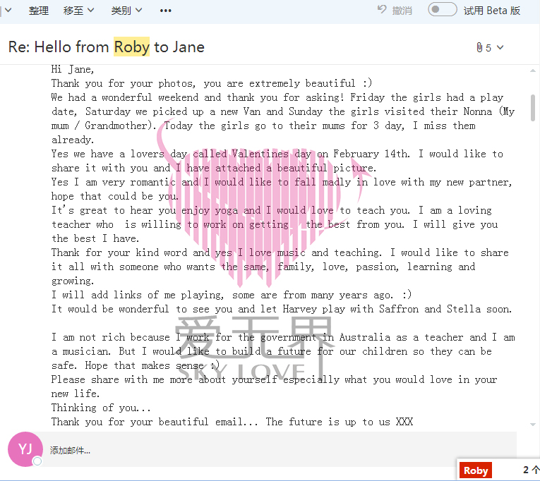 备注:男士Roby,45岁,澳大利亚墨尔本人。目前是一名为政府工作的音乐老师。热爱音乐和瑜伽,经常和乐队到各地演出。刚刚获得瑜伽教练培训证,准备开一家属于自己的瑜伽培训机构,这正是和女士很相似的地方。女士Jane,43岁,也喜欢练瑜伽,希望以后男士可以教她更多,以后在一起后可以帮忙男士的事业。