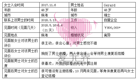 两人顺利的联系着,2018年4月中旬,意料之外的事情发生了,Gerard做出了一个让大家又惊又喜的举动,Gerard虽然远在国外,但却通过网络与Monica求婚了,求婚了,求婚了!!!小编激动得把这重要的事情说了三遍!男士5月将会来中国见Monica并希望求得她同意登记结婚。这突如其来的求婚让教练又一次陷入了深思,建议Monica无需急于做决定,再给自己多一些时间考察男士。接下来的相处时间里Monica发现自己与男士性格非常合得来,在男士再次提出要来中国见女士并求婚的请求时,Monica欣然答应了。Gerard预定了飞往珠海的机票,准备好了单身证明等证件只待快点来到中国。