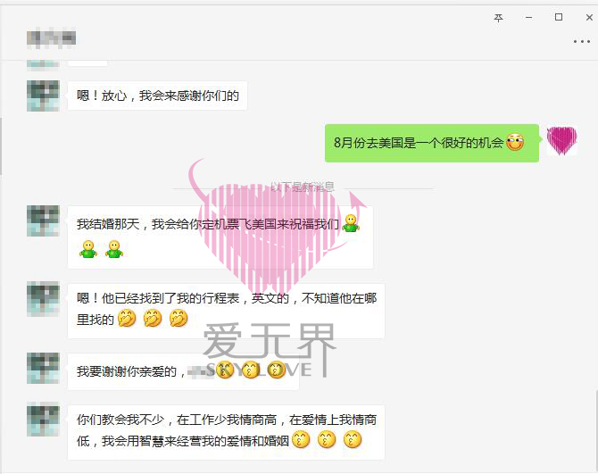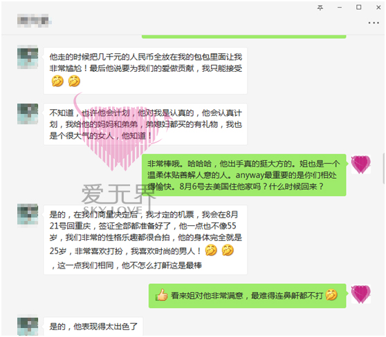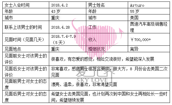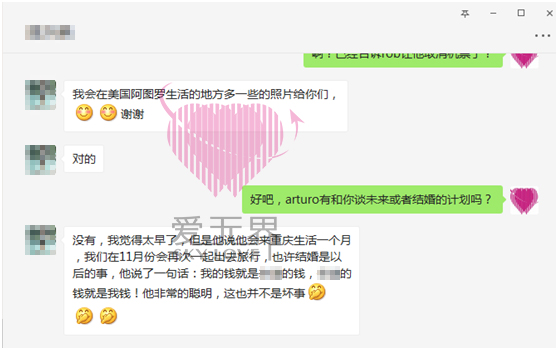 Cindy很激动、兴奋的跟教练分享着:"每天在与Arturo的聊天中,我都有谈恋爱的感觉。无论Arturo工作有多忙,都会及时回复我的信息,就算忘记带手机也会马上发邮件给我,因为他害怕我担心,害怕我胡思乱想,还会立刻新注册一个微信号方便我们聊天,哈哈!!!他5月中旬便订好了7月初来重庆的机票,他告诉我想真实的见到我,能触摸到我的脸,想拥抱我,想和我呆在一起,以此减少对我朝丝暮想的情丝!(*^__^*)嘻嘻……他很贴心的订好了我家附近的酒店,尽量争取我们能够多一些在一起的时间。本来打算我去接机的,可是Arturo拒绝了,他说想以最佳的状态来见我,所以他自行前往酒店梳妆打扮好再见面,哈哈……不过见到他的真人真的非常帅气,精致时尚,一点都不像55岁的人。跟他相处的这几天,感觉每天都沐浴在爱河,无论性格、外形、生活习惯上都非常合适。临别前,Arturo还送了一个印有我们照片的抱枕,还要我每天都抱着睡觉。我一切都是按照你教我的,我能感觉到Arturo非常的感动。他还把他接下来的计划都跟我说了,要我8月份飞到美国游玩,看看他的生活环境,11月份会跟我再去其他地方度假。Arturo还把花剩的几千块钱人民币全部塞给我说要给我花,我坚持不收,可是他嘟起嘴不开心了,他说这代表着他对我们爱情的一个承诺,哈哈……他真的既可爱又很真诚。"