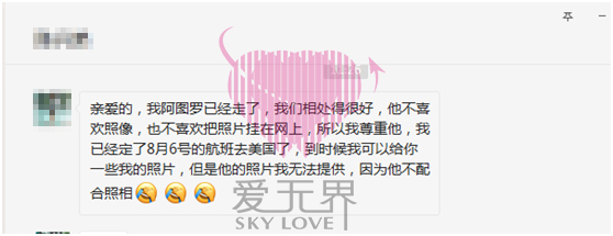 我找国外伴侣的原因是:他们更真诚的看待感情,会把爱情看得更重,并且对对方的子女更有爱。我也喜欢外国男士健康的生活,如锻炼、旅游、健身;并且性格幽默,对女士有礼貌。如果我找到自己异国的另一半,我们会商议,在他的国家或者我的国家共同生活,这样也很有趣。我希望大家能彼此多些耐心来克服语言障碍,学习彼此的文化和语言,这样生活才会更加有趣。"