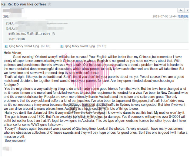 男士是来自悉尼的53岁的古董商,离异,没有孩子。对中国的文化非常感兴趣,收集古董是他的兴趣,后来发展成自己的事业,客户来自世界各地,他利用自己专业的眼光,并且因为会一点德语和意大利语,可以让他去其他国外的网站竞价得到一些他喜欢的名贵的古董。尼尔还是一个非常体贴和有耐心的人,对语言的障碍也抱有很大的希望,相信耐心和彼此理解能够克服一开始的语言关,之后再慢慢熟悉彼此。两人天天保持交流,两人已经谈到让男士来中国见面。