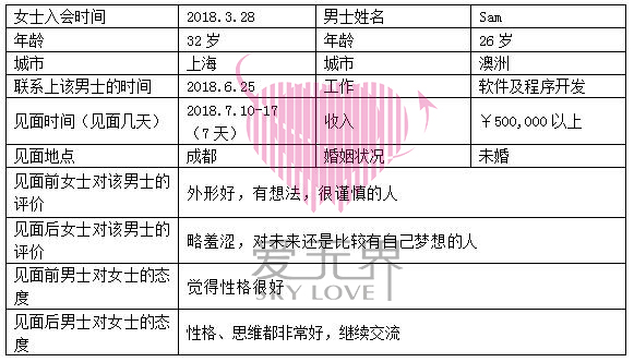 2018年6月25日,翻译老师向Lynn推荐了来自澳洲26岁的Sam,一个比Lynn小6岁的阳光帅气的男孩,一名软件及程序开发人员。起初翻译老师与情感教练担忧两人在年纪与阅历上会有差异,可能会影响彼此间的交流。教练还专门针对年龄差距可能会存在的思想层面和沟通交流层面的问题在沟通技巧上给Lynn作出了分析和建议。经过进一步的接触,我们发现虽然Sam的年纪较小,可是在待人接物中是非常的成熟谨慎的,是个比较有个性和想法的人,交流过程中并没有完全对女士敞开,反倒是Lynn爽朗大方,每次和Sam的交流总是知无不言、言无不尽。