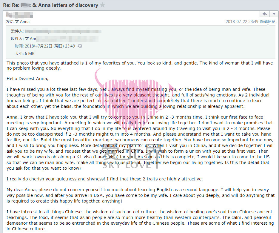 安娜,我说过在未来两到三个月会去中国见你,这个见面太重要了,决定了我们要在一起的见面。我不想随便做出承诺,所以我现在做的每一件事都是围绕着能在这两三个月内去中国见你,但是如果需要4个月希望你也不要介意。请理解我,我想牵着你的手一辈子。共同创造我们两个人美好的婚姻。你对我来说已经变得如此重要了,我希望带给你幸福。关于我的计划的更多细节。我想当我到了中国以后,如果你决定了要和我在一起,那我就向你求婚,让你做我的妻子,我们可以先订婚。然后我们就去为你准备未婚妻签证,等签证下来你就可以过来美国作为妻子和我一起生活了,当然我们还要做好一切需要该公证或准备的。这是你想要的未来吗?