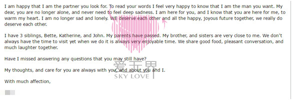 我很开心我是你要寻找的另一半,每次读你的信我都很开心我能够成为你想要的男人。从此以后你再也不会孤单了因为有我,我再也不会寂寞了因为有你。我们可以彼此拥抱,一起携手走完我们的下半生。