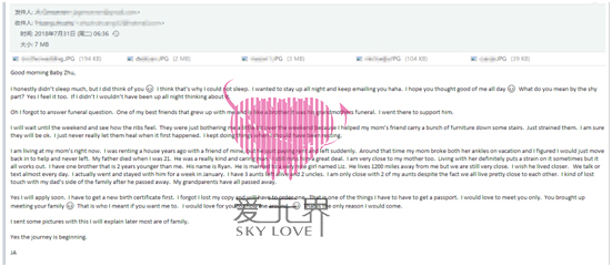 男士JA,这是专属于女士叫男士的昵称,来自美国,是IT技术男,手艺非常好,会修理技术产品。女士珠珠,来自海南。男士每次的信件都非常真诚,因为存在时差问题,男士即使睡觉了还会半夜起床看看女士是否回信了,可见男士是有多在乎女士呢!男士知道女士有2个小女儿,这个也是女士一直担心男士不能接受的原因,但是男士表明自己不介意,还说如果将来结婚,首先做的就是把女士和她女儿们带到美国。