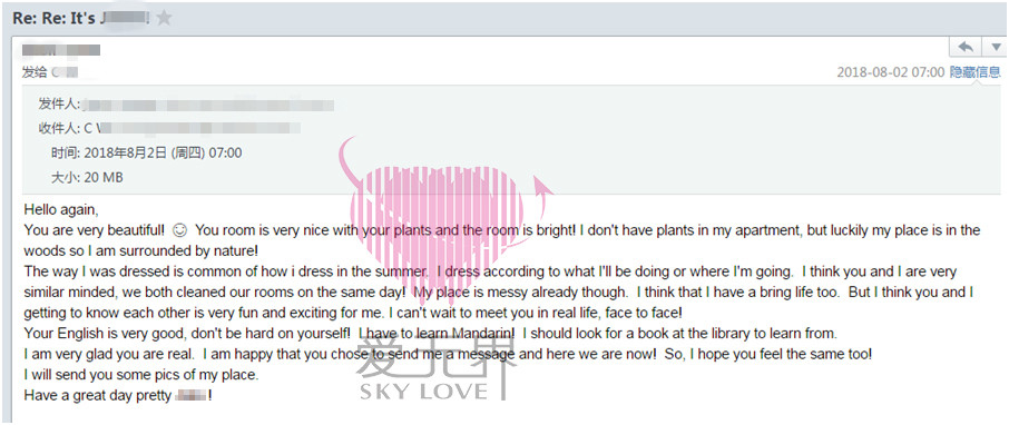 男士J,39岁,来自加拿大温哥华。女士Hanna,30岁,来自辽宁鞍山。男士对女士很热情,喜欢女士漂亮的外形和开朗积极的性格,对两人长距离的恋爱交流很有信心,目前已经开始自学中文,希望减少两人见面的交流阻碍。女士Hanna对男士真诚的态度和人品很欣赏。男士目前正在办理中国签证,决定9月18日到鞍山和女士见面并一起庆祝女士生日。