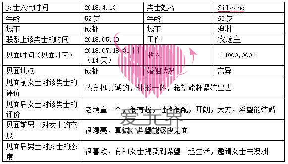 2018年5月9日,翻译经过筛选匹配后,向女士推荐了来自澳洲今年63岁的农场主Silvano(小编不自觉的脑补了许多画面:在大大的农场上与各种动物追逐,奔跑在绿草如茵的大草地上,还有着许多吃不完的蔬菜瓜果。如此的惬意、舒适,空气环境棒棒哒!!!)。温暖的关怀和丝丝的情意从Silvano的每一封信件里传递过来,灿烂的笑容让人看着非常的舒服愉悦,Judith一边不断的和教练老师学习和外国男人恋爱的小技巧,一边用这些小技巧稳稳的和男士交流着。