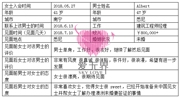 7月10日,Albert特意开了3个小时的车来到约定的地点与Sofia见面,两人一见如故。虽然Sofia不懂英语,可是有了前期与西方男士见面交流的经验,加上Albert是一个条理清晰,非常体贴耐心的绅士,相处过程中处处呵护着Sofia,两人相处非常的愉快。