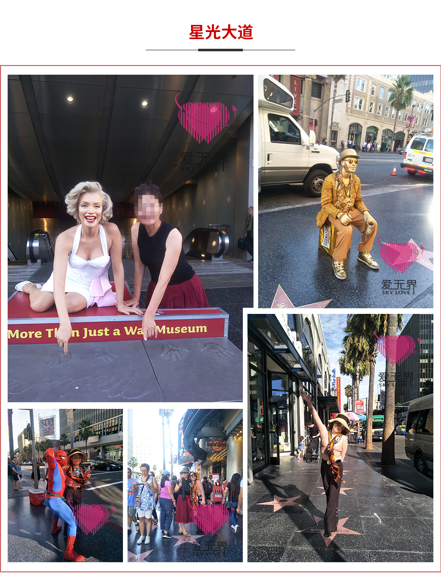 玛丽莲・梦露、蜘蛛侠、街头表演……让人应接不暇,仿佛置身于曾在大屏幕中看到的各种大片中,很是新奇有趣,这是属于美国洛杉矶当地的人文生活特色。