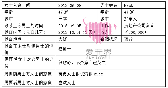2018年9月5日,来自加拿大,今年47岁的Beck在服务团队的推荐下,与石女士相识。Beck是房地产公司的高管,平时工作很忙,经常需要参与各种会议。