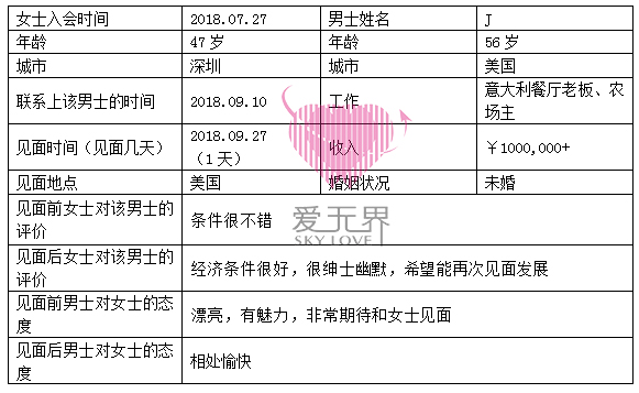 2018年9月10日,服务团队为女士匹配了来自美国,今年56岁的J,J是意大利餐厅的老板,拥有自己的农场。经过服务团队协助女士与男士建立的彼此了解和感情基础,J深深的被这位中国女士吸引着,非常期待与Scarlett见面。