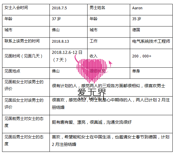 2018年12月6日,Aaron从德国千里迢迢来到佛山女士的家中,两个相爱的人终于见面了,毫无陌生感的两人紧紧相拥,为了给两人多一些相处,让彼此更加了解的时间,女士原本计划让朋友照顾自己的孩子几天,但立刻就被男士拒绝了,Aaron认为,不应该因为自己冷落孩子,女士自然是答应的,内心也是开心不已,她没有看错,他是一位懂得疼爱孩子的好男人,更是个懂她疼她的真男人。