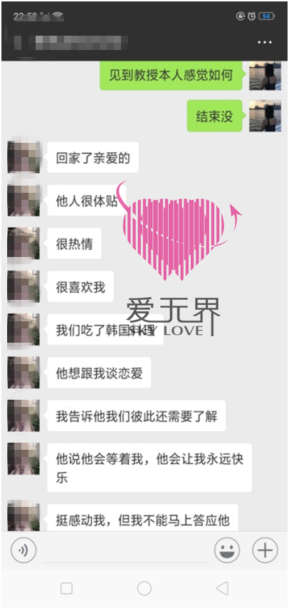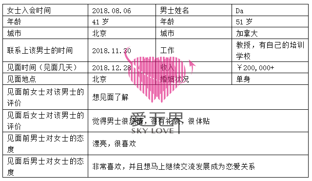 男士Da是一名教授,有自己的培训学校。作为教授的他有着帅气儒雅的外表,风度翩翩。Da就在北京工作,平日里喜欢旅行,原本就近在咫尺的两人,在阿里红娘的牵线搭桥下结识,随着两人愈发深入的交流,男士迫不及待从旅行的城市回到北京,并约好30号见面,但是因为男士的父亲刚好有事,可能需要男士回到加拿大家中照看,不想错过和女士见面机会的男士,在邮件里和女士言明了自己的歉意并和女士相约28号见面。一直很配合教练的Mary明白,每一份爱都来之不易,要懂得珍惜,所以,虽然男士在某些方面让女士不是很满意,但依旧珍惜每一次的见面。