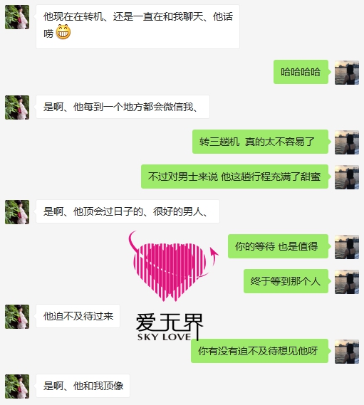 阿里红娘教练寄语:无论是哪段感情,都没有那么容易,在遇到自己的王子之前,请积极的提升自己,王女士在入会时,就积极去配合教练,提升自己的英语水平和交流技能,最终每天才能和男士每天视频6小时,达到心灵的契合。同时,教练给到王女士的每一个男士,王女士都会积极去把握机会和男士交流,也在交流的过程中不断和教练沟通,有困惑或是困难时都主动提出来,非常信任教练,最后实现情感上真正的蜕变,收获成功!