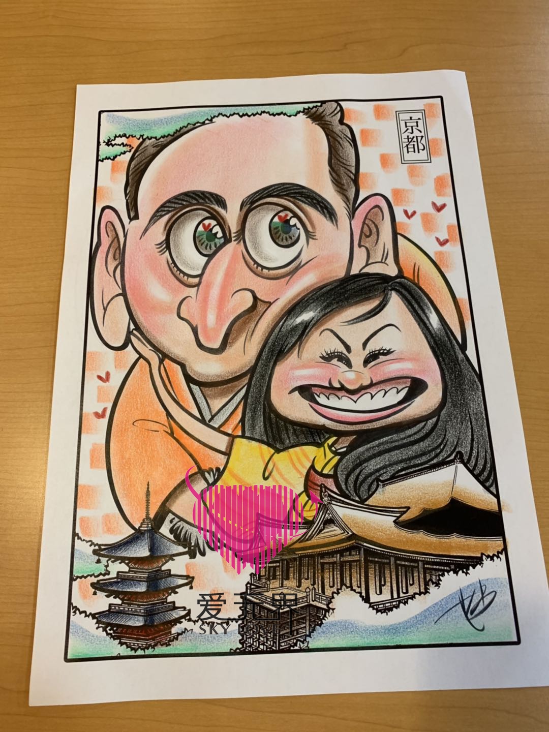 1月16日,两个人一起去京都清水寺游玩,清水寺有一些特别有意思的漫画家,两个人觉得有趣,于是叫画家帮他们画了一幅搞笑漫画,男士说要带回家,挂在家里,这是他们美好的回忆。