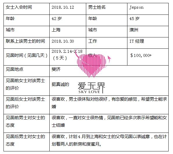 目前两人已经计划4月份Jepson和女士见面的事宜,男士知道女士喜欢住在海边,筹划着去海边看起了新房子,希望Jing未来能成为新房子的女主人,还计划两人结婚后度蜜月的事情,期待他们再次的见面给我们带来更多的好消息,服务组衷心祝福他们有情人终成眷属!