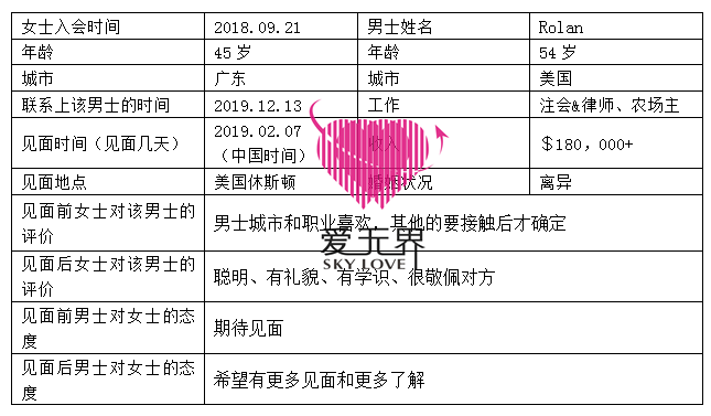 刚刚入会时,谢女士对男士的择偶方面要求有些严格,内容具体到男士的城市以及具体身高,在走跨国交友的第一步时,很多时候不要给自己设限太多,最后你的选择面会更广,同时也会遇到很多不一样的惊喜,谢女士也希望自己能够遇到更多的惊喜,在和教练的交流下,谢女士慢慢放开了自己的这些局限,很快就遇见了现在的男士Rolan。Rolan是一位非常有学识的男士,除了自己是美国的会计师和律师以外,他自己还经营着一个农场,平时交给哥哥打理,周末的生活就会自己亲自去农场照料,事业不错。