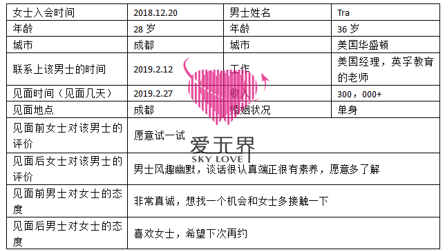来自美国的Tra, 在美国是一位经理,一年前他来到成都,在英孚教育担任一名外语老师,他慢慢喜欢上这座城市以及这里的美食,当看到龙女士的那一刻,就非常喜欢她了,在平台上主动和女士聊起家人、工作和自己的兴趣爱好,每一次的来信内容都能感受出他对女士的喜欢,阿里红娘团队能够感受到男士的真诚,把男士推荐给了女士交流。