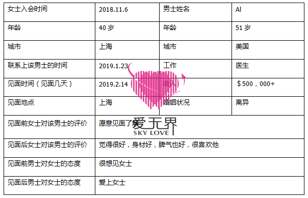 缘起在指尖的流转间,爱情不知不觉产生,赵女士和美国Al的相识非常的简单,源于一次很平常的打招呼,都没想过会和彼此擦出怎样的火花, 因为Al在中国上海做一名医生,幽默的他和赵女士吐槽自己的工作太忙碌,很少时间去学习中国的语言和文化,而赵女士看到男士的留言时,似乎也感受到男士在日常工作中很忙碌的情景,用非常调皮的语气安慰了男士,两个有着共同想法的人开心地互聊了起来,语句间简短又默契。赵女士也非常想学习国外的语言和文化,就这样,两人开始聊起了见面的事情,男士很期待和女士的见面,希望和女士互相交流,分享彼此有趣的事情,最后,男士不忘留下自己的微信号并夸赞了女士非常漂亮,这一次的聊天,好像在为爱情积累能量,彼此对对方都有一次非常好的印象,一次甜蜜的邂逅啊。