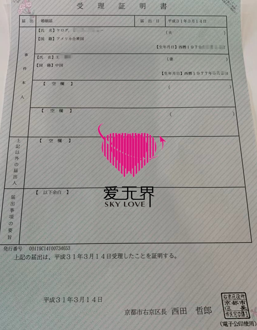 2019年3月14号,王女士和男士如约结婚啦!经历将近一个多月的分别,两人终于在一起,往后余生都在一起。来晒晒,日本结婚证是这样的,一纸婚书,对于他们来说却有着特别的意义。
