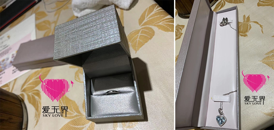 这次男士过来,给王女士带来了一枚婚戒,知道女士喜欢简单大方的款式,特意按照女士的喜好买的,还送了女士钻石项链和钻石耳环,一个人最幸福的时刻,就是找对了人,他宠着你,纵容你的习惯,并爱着你的一切,王女士感觉非常幸福。登记结婚以后,两人一起去香港吃美味的午餐,一桌子满满的,生活就要像这样充满仪式感,在餐桌上,两人继续把这种爱和幸福延续,互相表达着爱意,庆祝彼此成为一家人,Alex更是感动地流泪。