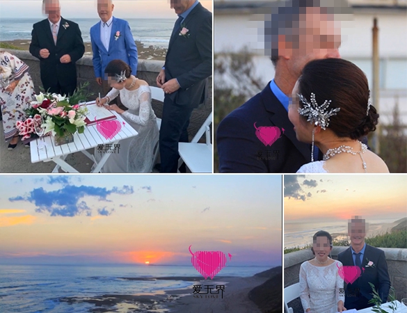 远处,余晖渐渐落下,蓝色的云和橙色的落日互相融合在一起,那个时刻无比浪漫,王女士和Pat书写下他们各自的姓名,从此,他们都有了一个新的身份,王女士是Pat的妻子,Pat是王女士的丈夫。在这个庄严的时刻,两人的眼里都充满了幸福的光芒,他们相拥着,为这一刻快乐和感动。