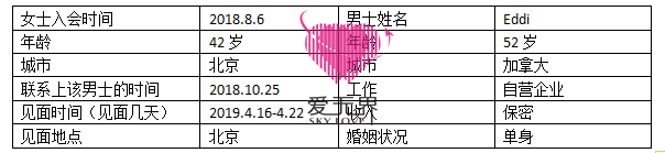 Eddi是加拿大人,有庞大的家族生意,除了经营家庭生意外,还有自己的事业,今年52岁的他非常帅气,当阿里红娘把男士的资料和照片给女士看的第一天,Mary就对男士很有好感,很想把握这位男士。