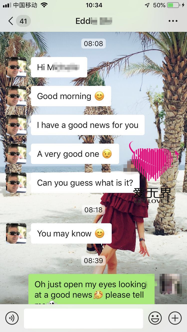 令Mary惊喜的是,在阿里红娘,她在不断地收获爱。她有5个优质男士在选择,其中一个已经向她求婚,女士直言自己忙不过来了,Eddi便是女士交流的其中一个男士。
