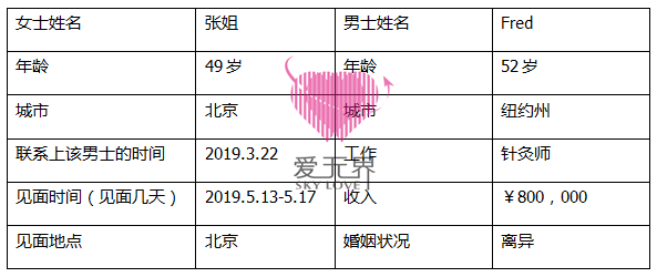 当你开始去认真对待一件事,并为之努力时,缘分也在悄悄来到你的身边,很快,属于张姐的情缘来到了。和张姐一样,Fred是一位非常有趣的男士,当两个有相同频道的人遇到一起时,他们很快擦出爱情的小火苗,Fred和张姐分享自己的爱好,他告诉女士自己喜欢户外活动、针灸还有瑜伽冥想,所以自己现在有非常健康的身体和健硕的体魄,语气非常诚恳。