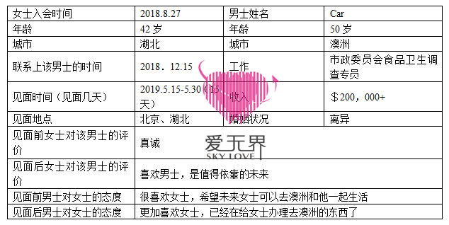 在2018年12月,来自澳洲的Car主动和女士打起了招呼,一上来就自报家门,把自己的情况都和女士介绍了一遍,他告诉女士,自己的生活简单、规律,目前是市政委员会做食品卫生调查的专员,平时还会教授空手道,阿里红娘服务组感受到男士的真诚,很快把男士的微信推荐给女士。