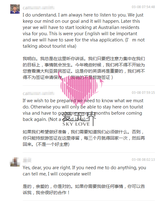 Car没有给女士很多承诺,却一直在用行动去向Fanny表达着自己的心意,送女士翡翠镶金项链,给女士的家人精心准备礼物,走的时候还一直给钱给女士,为女士花钱买单,目前已经发来邀请函邀请女士过去澳洲,在跨国交友里面,实实在在的行动更能表达心意,阿里红娘衷心祝愿Fanny的这段感情能够开花结果!期待两人接下来的进展。