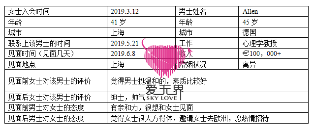 目前Allen已经飞回德国,他给女士发来信息,说,这次见面非常愉快,夸赞女士美丽、可爱,他非常真诚用心地向女士表白,“我当初想见你的梦想终于实现了。”阿里红娘服务组看到这句话都被甜到了。
