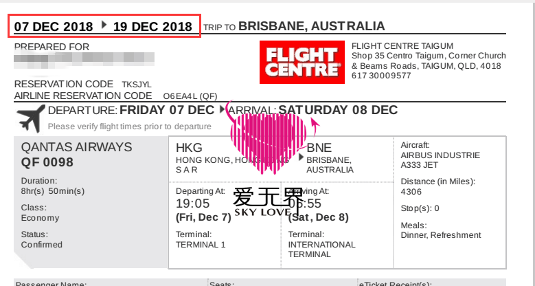 这就是西方男士的爱,只要确定是你,就会全心全意为你付出,2018年12月7号-12月19号,女士飞往布里斯班和Scot再次相聚,12月的澳洲机票很贵,男士打来电话说,机票贵,让我来搞定,真是一个非常给力的西方男友啊!